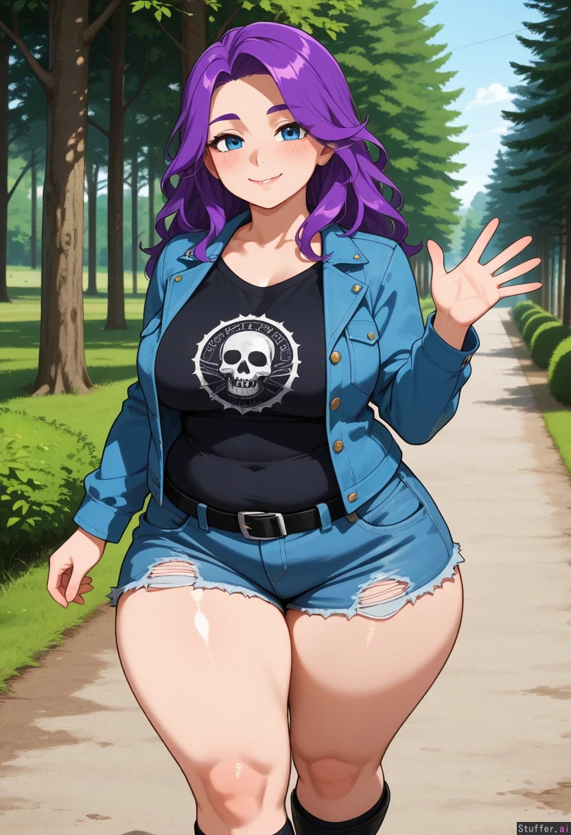 (perfect hands), 1girl, Abigail_(Stardew_Valley), fair skin, detailed blue eyes, long messy purple hair, Blushing smile, punk, waving, Wearing black tshirt, blue jacket, cutoff jeans, black belt, black socks, black boots, Soft breasts, wide hips, thick thighs, chubby, Walking, Background: forest pathway,