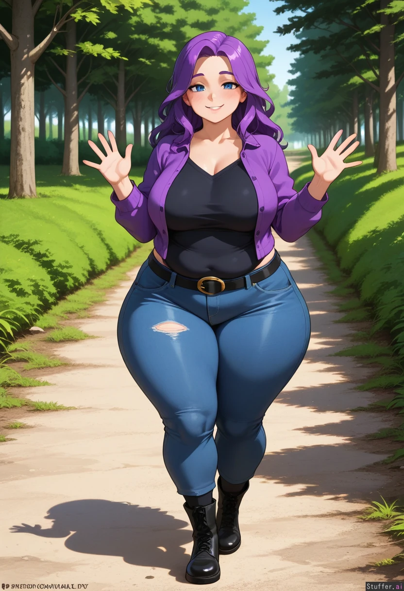 (perfect hands), 1girl, Abigail_(Stardew_Valley), fair skin, detailed blue eyes, long messy purple hair, Blushing smile, waving, Wearing black tshirt, purple jacket, shredded jeans, black belt, black socks, black boots, Soft breasts, wide hips, thick thighs, chubby, Walking, Background: forest pathway,
