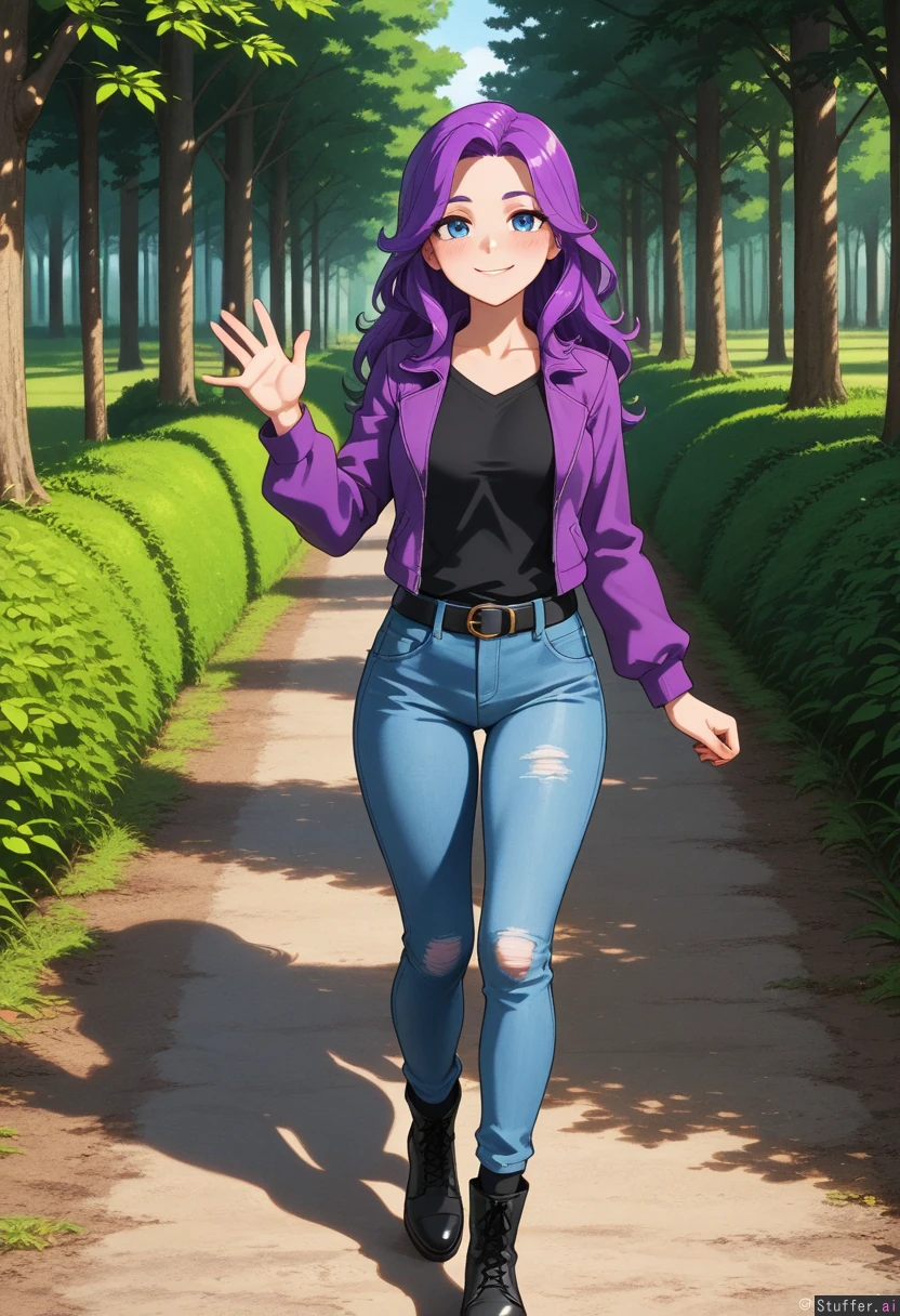 (perfect hands), 1girl, Abigail_(Stardew_Valley), fair skin, detailed blue eyes, long messy purple hair, Blushing smile, waving, Wearing black tshirt, purple jacket, shredded jeans, black belt, black socks, black boots, Walking, Background: forest pathway,