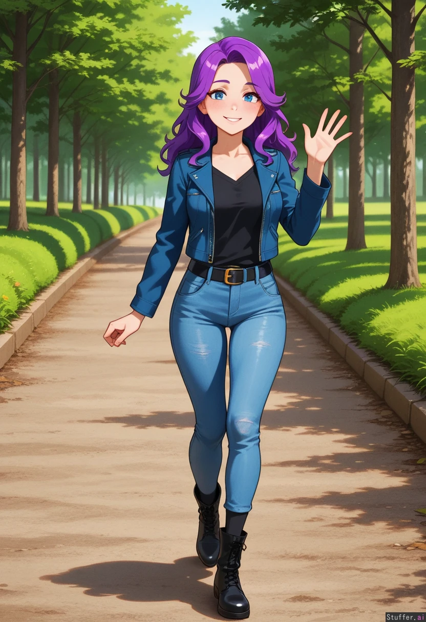 (perfect hands), 1girl, Abigail_(Stardew_Valley), fair skin, detailed blue eyes, long messy purple hair, Blushing smile, waving, Wearing black tshirt, darkblue jacket, shredded jeans, black belt, black socks, black boots, Walking, Background: forest pathway,