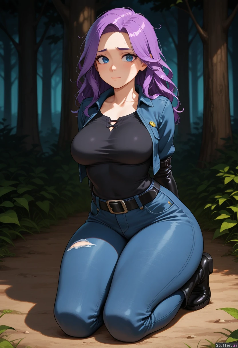1girl, Abigail_(Stardew_Valley), fair skin, detailed blue eyes, long messy disheveled purple hair, Worried, Wearing black tshirt, darkblue jacket, shredded jeans, black belt, black socks, black boots, Soft breasts, wide hips, thick thighs, Arms behind back, full black leather armbinder, Kneeling, Background: forest clearing,