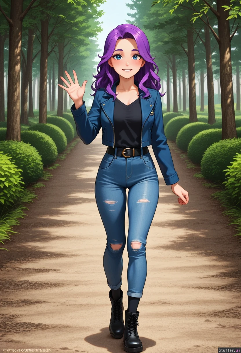 (perfect hands), 1girl, Abigail_(Stardew_Valley), fair skin, detailed blue eyes, long messy purple hair, Blushing smile, waving, Wearing black tshirt, darkblue jacket, shredded jeans, black belt, black socks, black boots, Walking, Background: forest pathway,