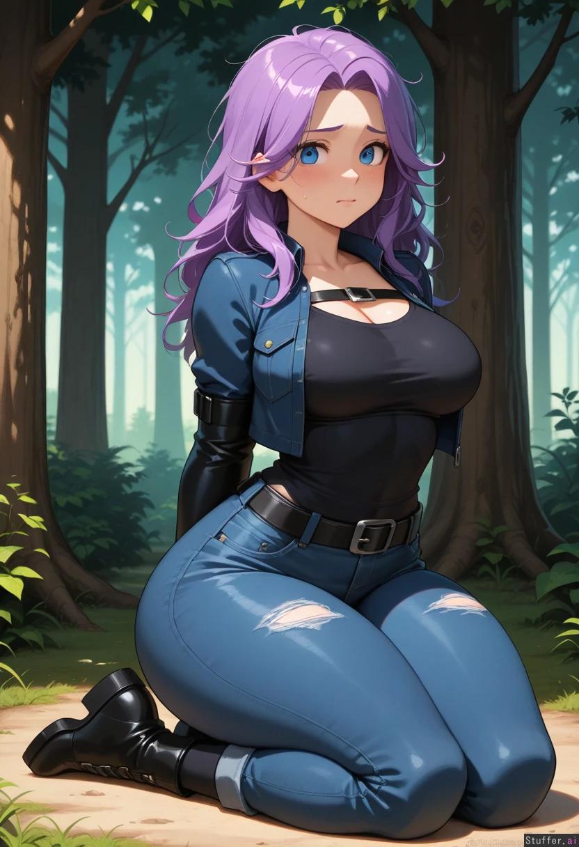 1girl, Abigail_(Stardew_Valley), fair skin, detailed blue eyes, long messy disheveled purple hair, Worried, Wearing black tshirt, darkblue jacket, shredded jeans, black belt, black socks, black boots, Soft breasts, wide hips, thick thighs, Arms behind back, (full black leather armbinder), Kneeling, Background: forest clearing,