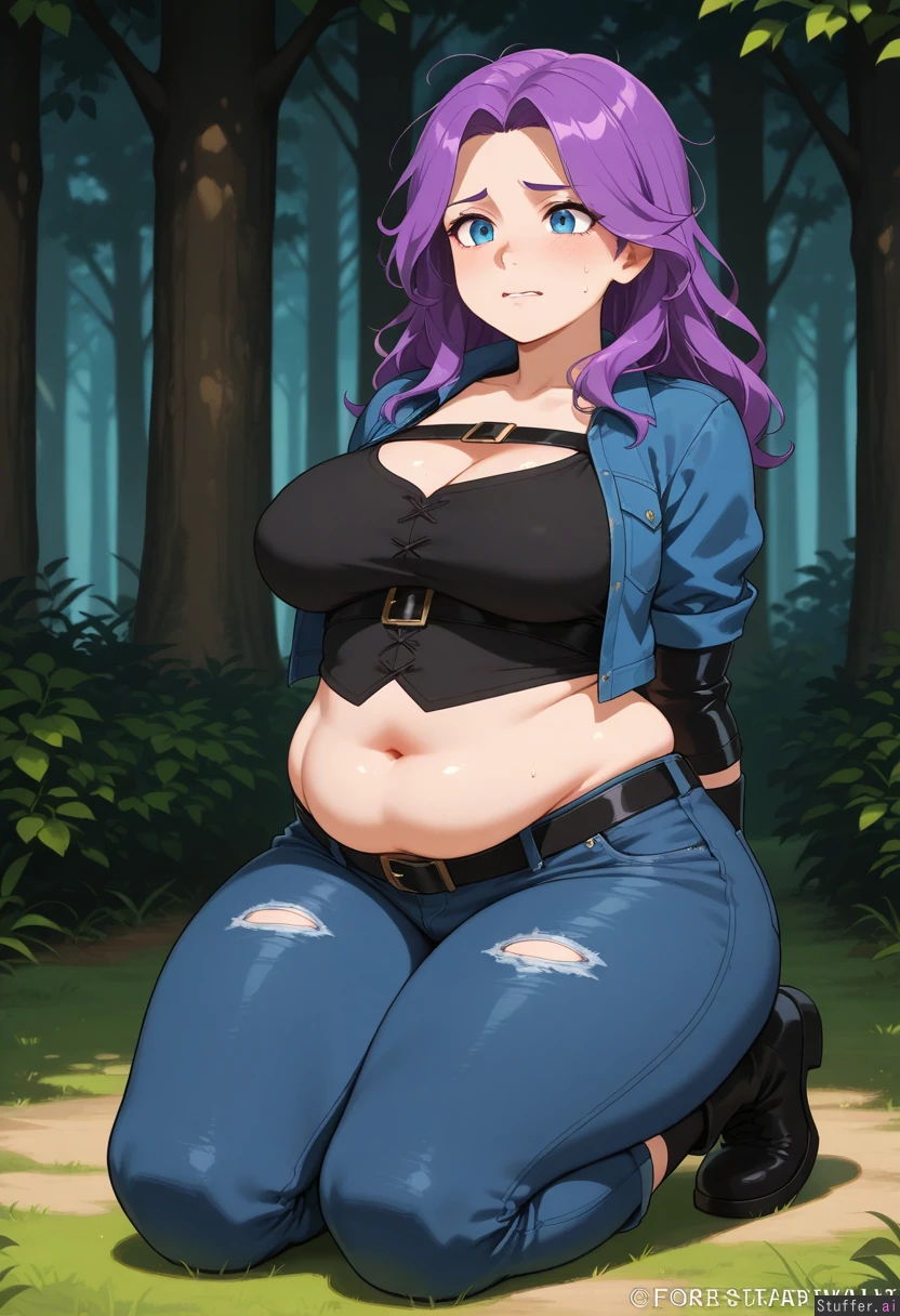 1girl, Abigail_(Stardew_Valley), fair skin, detailed blue eyes, long messy disheveled purple hair, Worried, biting lip, Wearing snug black tshirt, darkblue jacket, shredded jeans, black belt, black socks, black boots, Soft breasts, wide hips, thick thighs, swollen chubby belly overhang, Arms behind back, (full black leather armbinder, chest straps), Kneeling, Background: forest clearing,