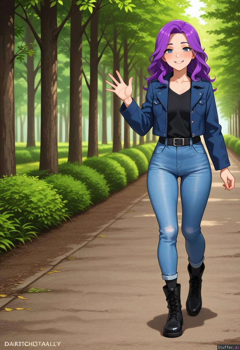 (perfect hands), 1girl, Abigail_(Stardew_Valley), fair skin, detailed blue eyes, long messy purple hair, Blushing smile, waving, Wearing black tshirt, darkblue jacket, shredded jeans, black belt, black socks, black boots, Walking, Background: forest pathway,