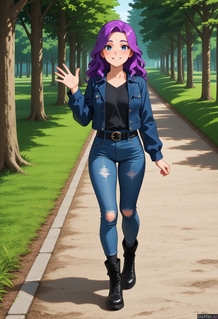 (perfect hands), 1girl, Abigail_(Stardew_Valley), fair skin, detailed blue eyes, long messy purple hair, Blushing smile, waving, Wearing black tshirt, darkblue jacket, shredded jeans, black belt, black socks, black boots, Walking, Background: forest pathway,