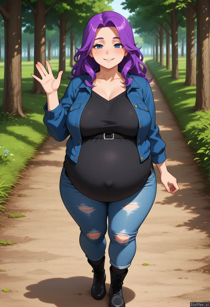 (perfect hands), 1girl, Abigail_(Stardew_Valley), fair skin, detailed blue eyes, long messy purple hair, Blushing smile, waving, Wearing black tshirt, darkblue jacket, shredded jeans, black belt, black socks, black boots, Pregnant, chubby, Walking, Background: forest pathway,