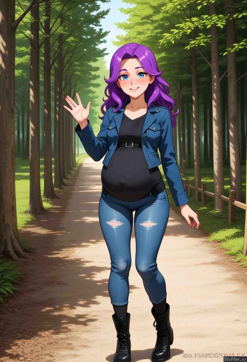 (perfect hands), 1girl, Abigail_(Stardew_Valley), fair skin, detailed blue eyes, long messy purple hair, Blushing smile, waving, Wearing black tshirt, darkblue jacket, shredded jeans, black belt, black socks, black boots, Pregnant, Waddling, Background: forest pathway,