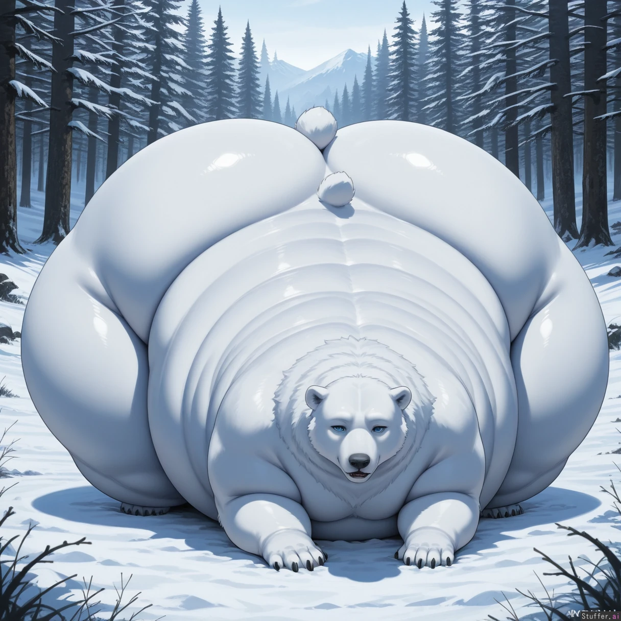solo, feral, polar bear, snowy forest, quadraped, aminal, beast, on all fours, presenting, blue eyes (huge hips:1.3), (huge thighs:1.2),, (morbidly obese:1.4)