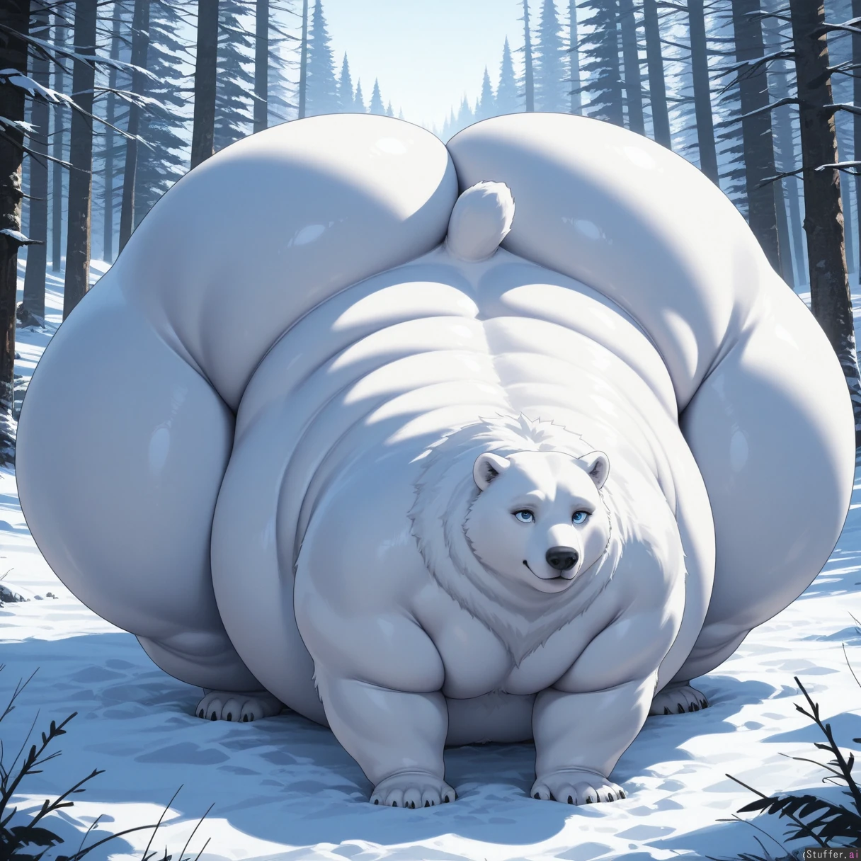 solo, feral, polar bear, snowy forest, quadraped, aminal, beast, on all fours, presenting, blue eyes, big eyes (huge hips:1.3), (huge thighs:1.2),, (morbidly obese:1.4)