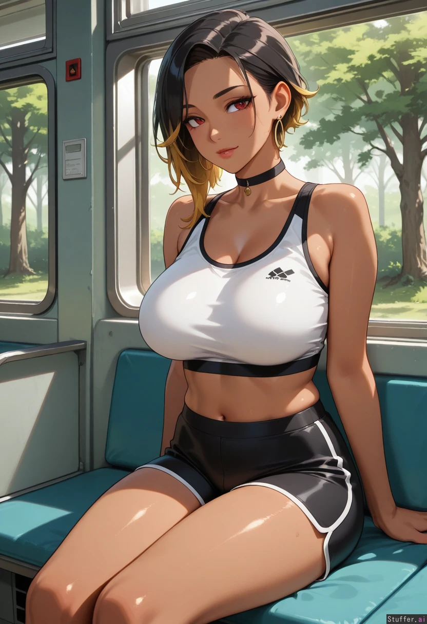 solo_female, mature face, tan, long_black_hair, asymmetrical hair, blonde_tips, red_eyes, choker, large earrings, sitting in_small_booth, window view of forest, midriff_exposed, white top, black gym shorts ( tight_clothing)