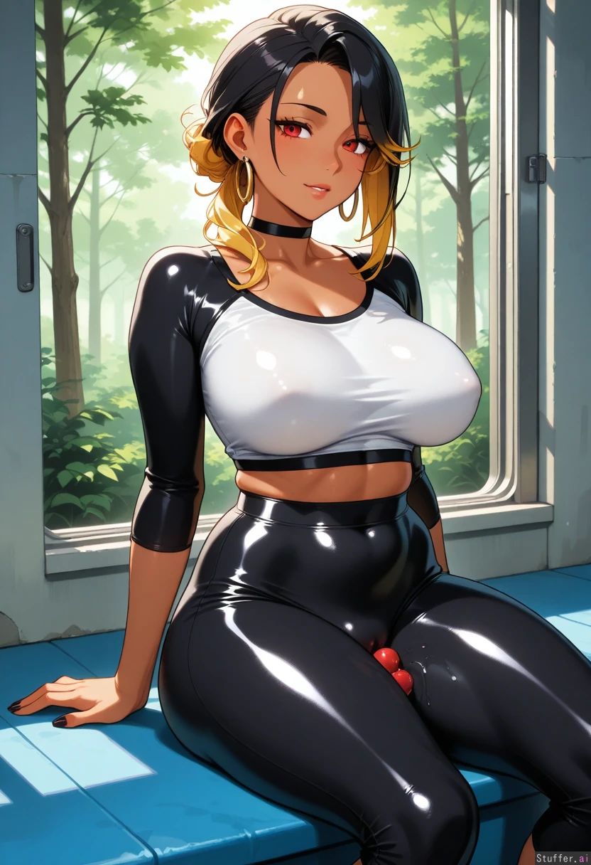 solo_female, mature face, tan, long_black_hair, asymmetrical hair, blonde_tips, red_eyes, choker, large earrings, sitting in_small_booth, window view of forest, midriff_exposed, white top, black gym shorts ( tight_bulges:1.6)