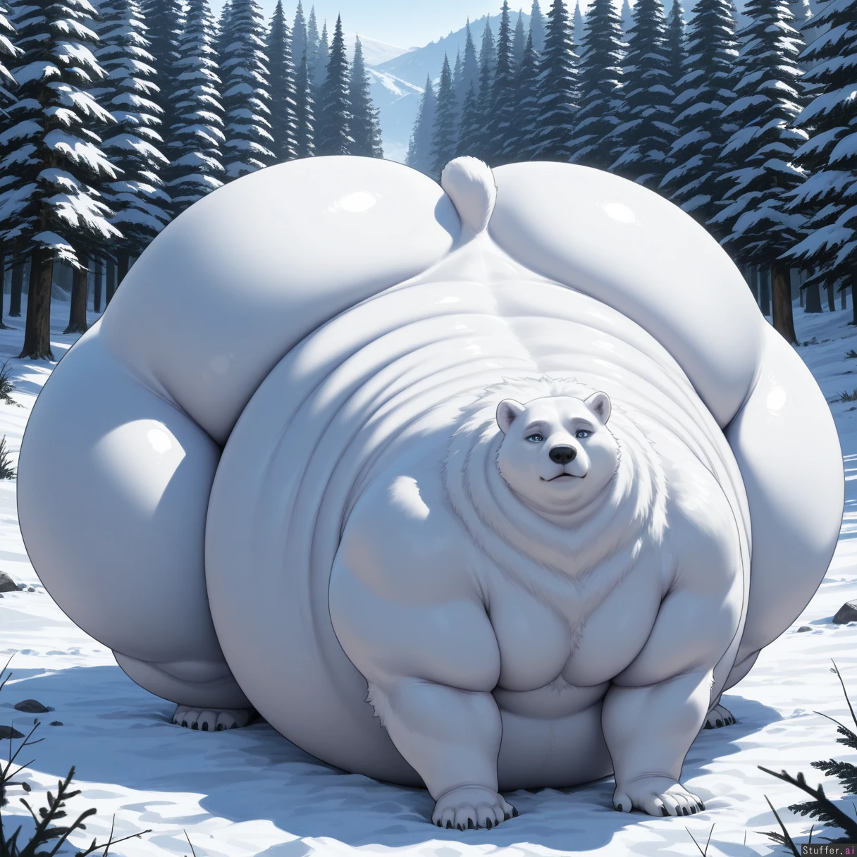 solo, feral, polar bear, snowy forest, quadraped, aminal, beast, on all fours, presenting, blue eyes, big eyes (huge hips:1.3), (huge thighs:1.2),, (morbidly obese:1.4)