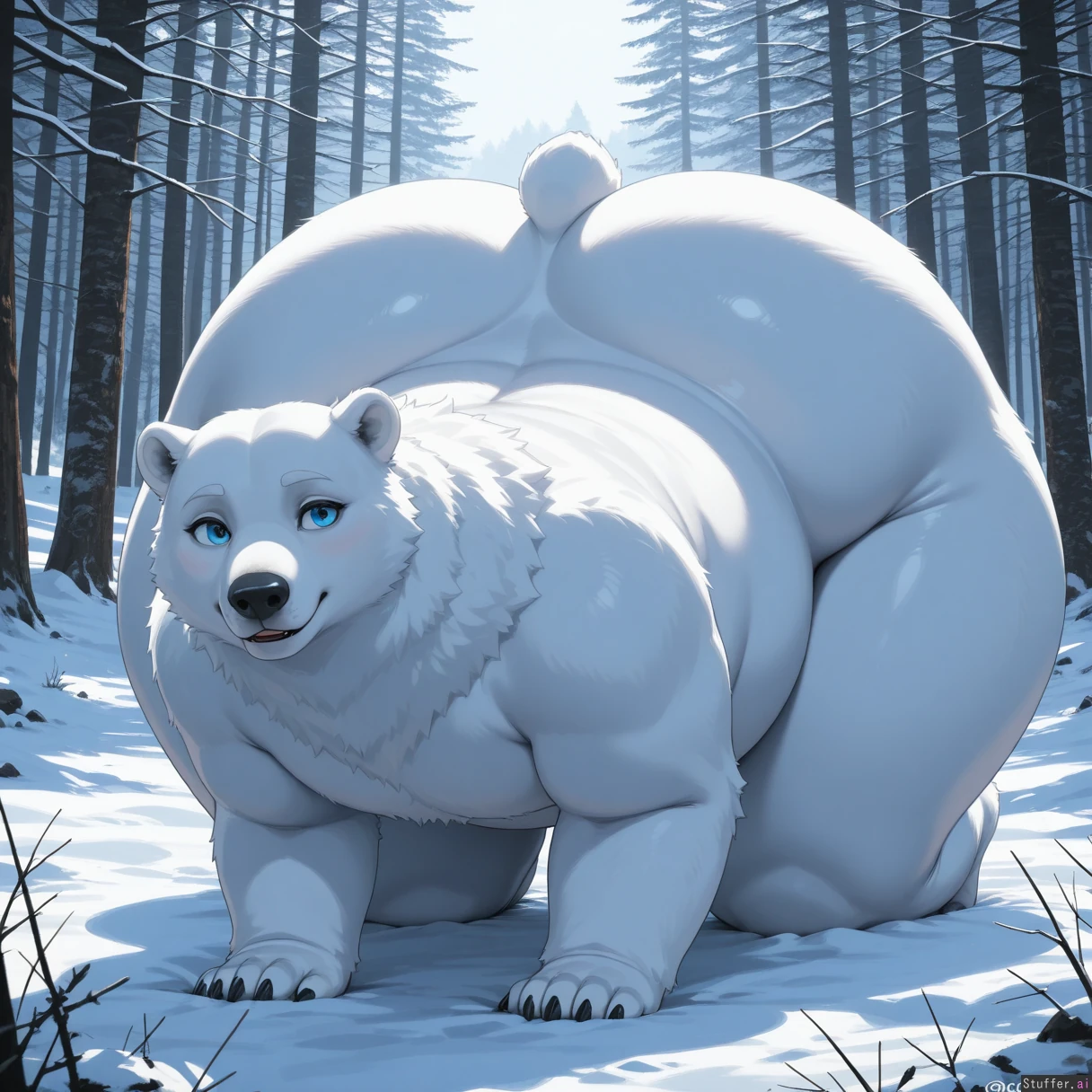 solo, feral, polar bear, snowy forest, quadraped, aminal, beast, on all fours, presenting, blue eyes, big eyes (huge hips:1.3), (huge thighs:1.2),