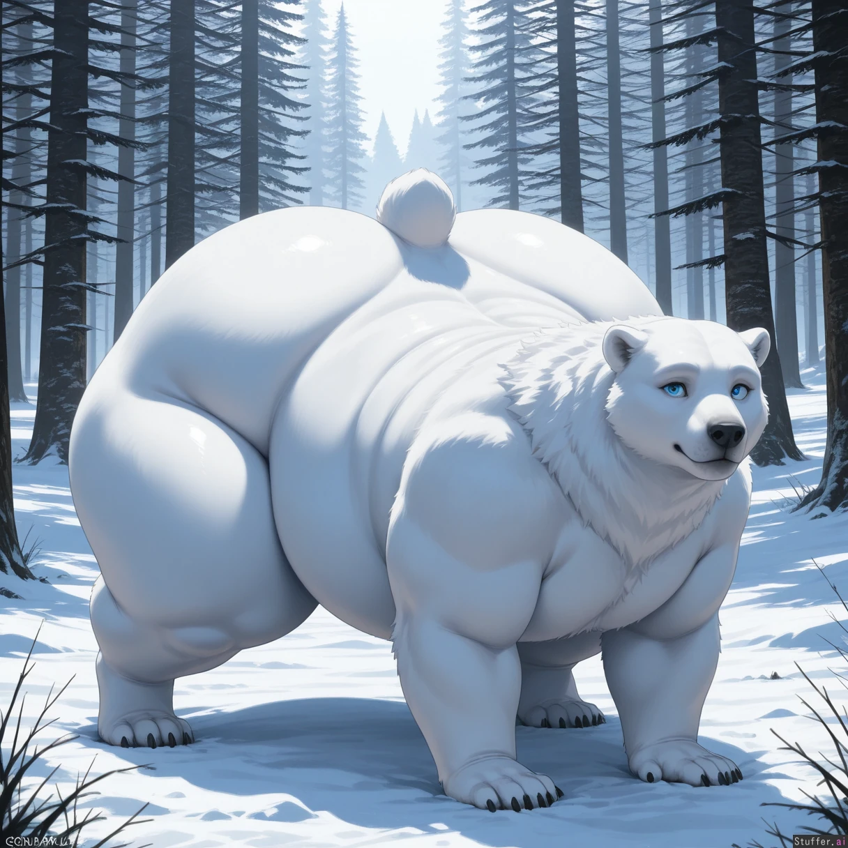 solo, feral, polar bear, snowy forest, quadraped, aminal, beast, on all fours, presenting, blue eyes, big eyes, digitigrade, paws (huge hips:1.3), (huge thighs:1.2), morbidly_obese