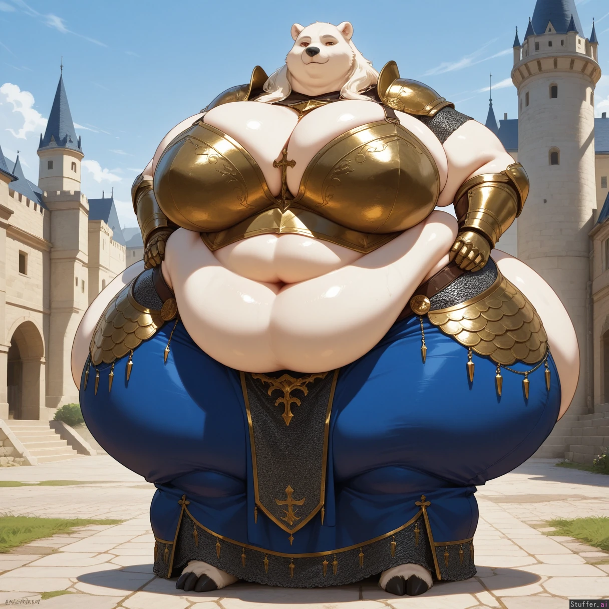 solo, anthro, polar bear, chainmail, tall, fat_arms, blue long skirt, bronze armor, cross, posing, full body view, long_hair, orange_eyes, fully_clothed, castle, outdoors, gauntlets, hooves, standing (huge hips:1.5), (huge thighs:1.2), (huge breasts:1.3), (ussbbw), (fat calves), (morbidly obese:1.4), (fat rolls), saggin_belly, exposed_belly