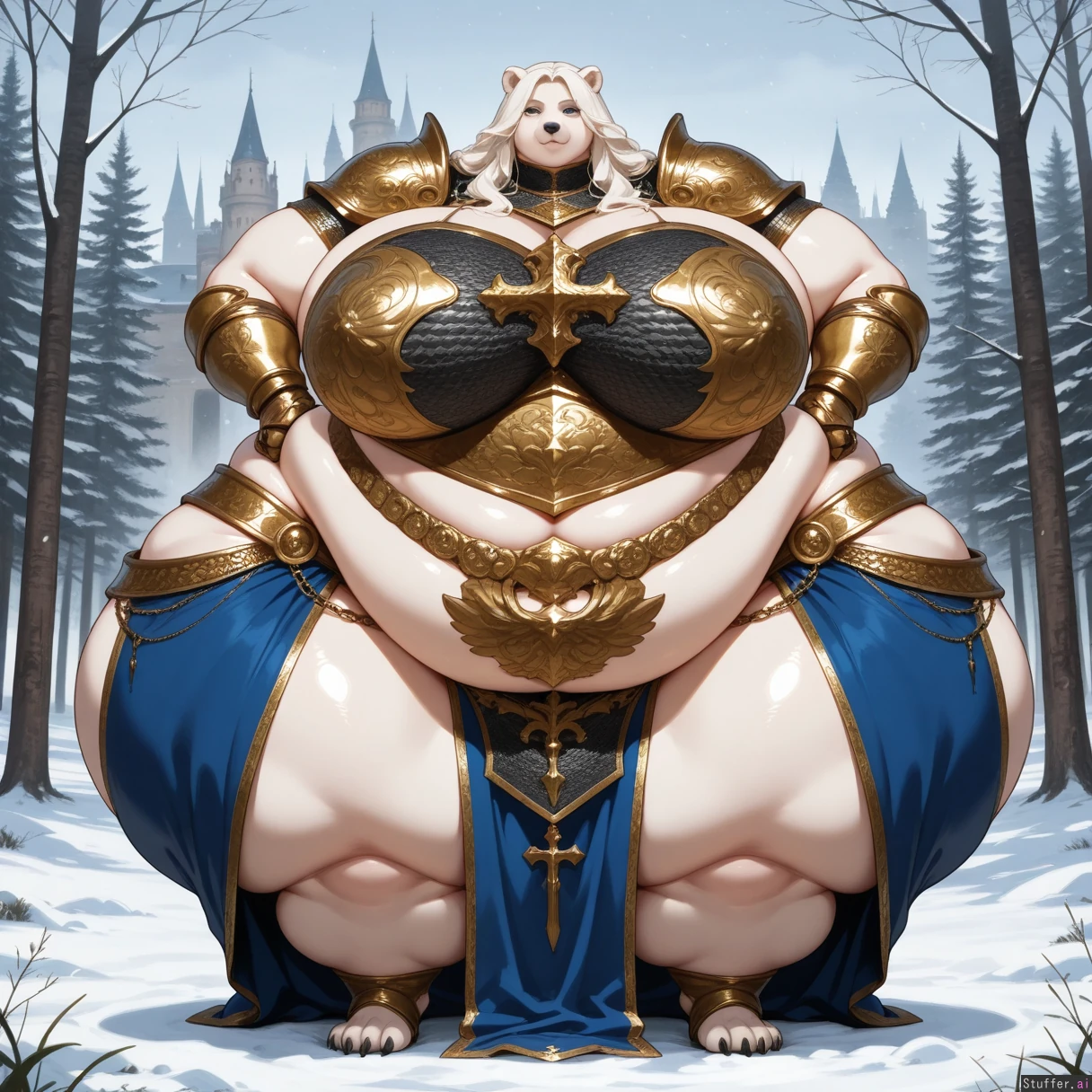 solo, anthro, polar bear, chainmail, tall, fat_arms, blue long skirt, bronze armor, cross, posing, full body view, white_hair, long_hair, blue_eyes, fully_clothed, castle, outdoors, gauntlets, digitigrade, standing, snowing, forest (huge hips:1.5), (huge thighs:1.2), (huge breasts:1.3), (ussbbw), (fat calves), (morbidly obese:1.4), (fat rolls), saggin_belly, exposed_belly