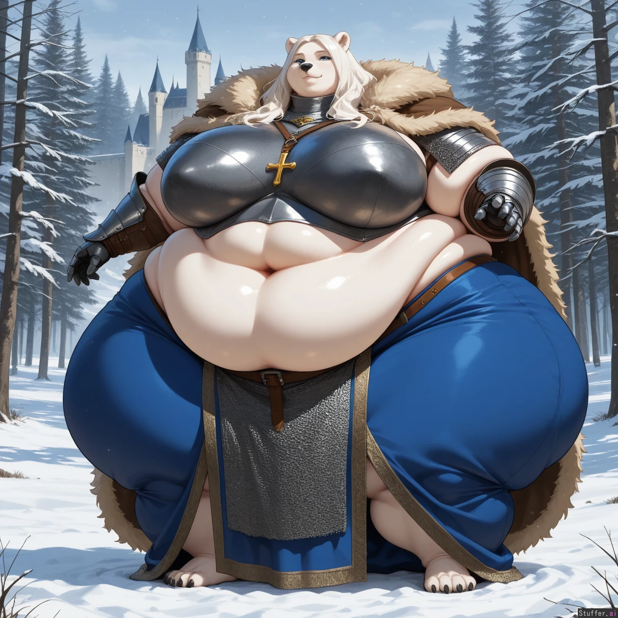 solo, anthro, polar bear, chainmail, tall, fat_arms, blue long skirt, armor, cross, posing, full body view, white_hair, long_hair, blue_eyes, fully_clothed, castle, outdoors, gauntlets, digitigrade, standing, snowing, forest, fur_cape, brownn_pants (huge hips:1.5), (huge thighs:1.2), (huge breasts:1.3), (ussbbw), (fat calves), (morbidly obese:1.4), (fat rolls), saggin_belly, exposed_belly