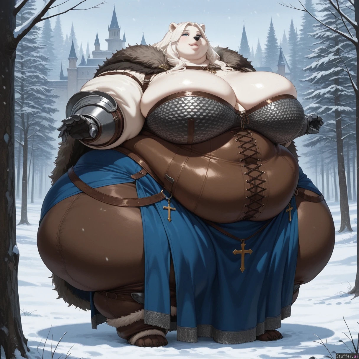 solo, anthro, polar bear, chainmail, tall, fat_arms, blue long skirt, armor, cross, posing, full body view, white_hair, long_hair, blue_eyes, fully_clothed, castle, outdoors, gauntlets, digitigrade, standing, snowing, forest, fur_cape, brown_pants, corset, black lips (huge hips:1.5), (huge thighs:1.2), (huge breasts:1.3), (ussbbw), (fat calves), (morbidly obese:1.4), (fat rolls), double_chin, chubby_cheeks