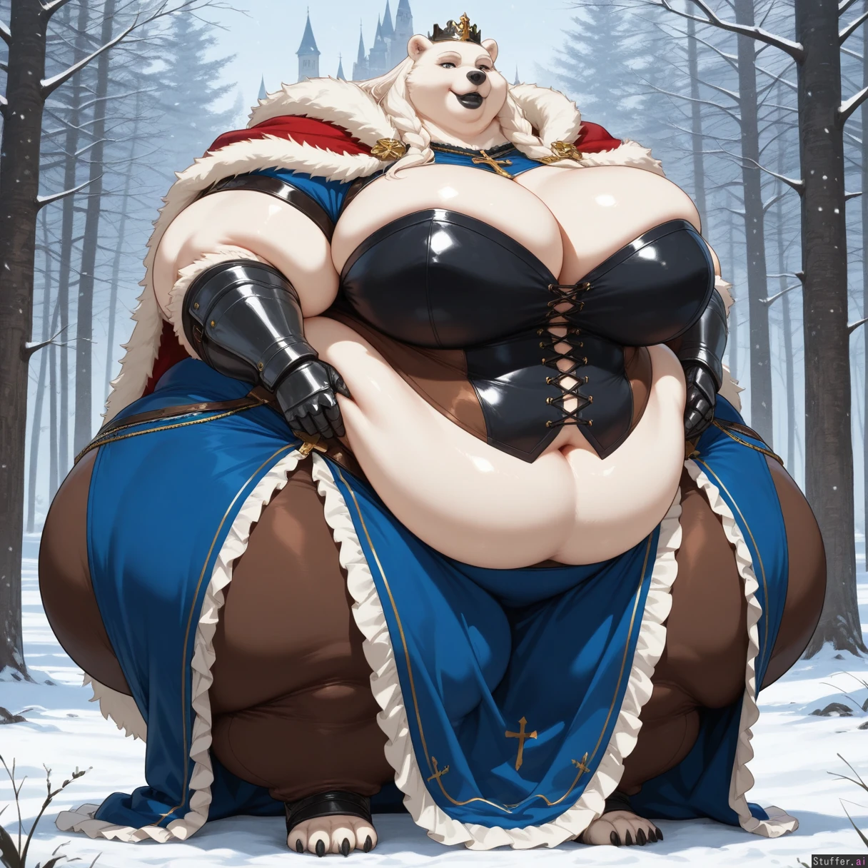 solo, anthro, polar bear, tall, fat_arms, blue long skirt, armor, cross, posing, full body view, white_hair, long_hair, blue_eyes, fully_clothed, castle, outdoors, gauntlets, digitigrade, standing, snowing, forest, fur_cape, brown_pants, corset, (black lipstick) (huge hips:1.5), (huge thighs:1.2), (huge breasts:1.3), (ussbbw), (fat calves), (morbidly obese:1.4), (fat rolls), double_chin, chubby_cheeks