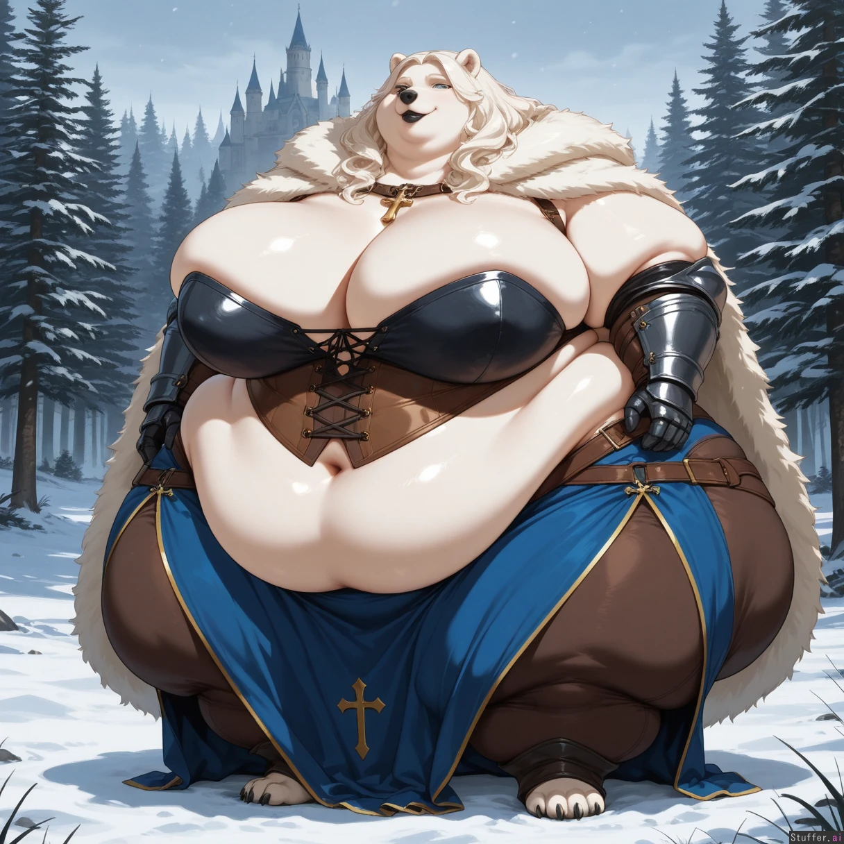 solo, anthro, polar bear, tall, fat_arms, blue long skirt, armor, cross, posing, full body view, wavy_hair, white_hair, long_hair, blue_eyes, fully_clothed, castle, outdoors, gauntlets, digitigrade, standing, snowing, forest, fur_cape, brown_pants, corset, (black lipstick) (huge hips:1.5), (huge thighs:1.2), (huge breasts:1.3), (ussbbw), (fat calves), (morbidly obese:1.4), (fat rolls), double_chin, chubby_cheeks
