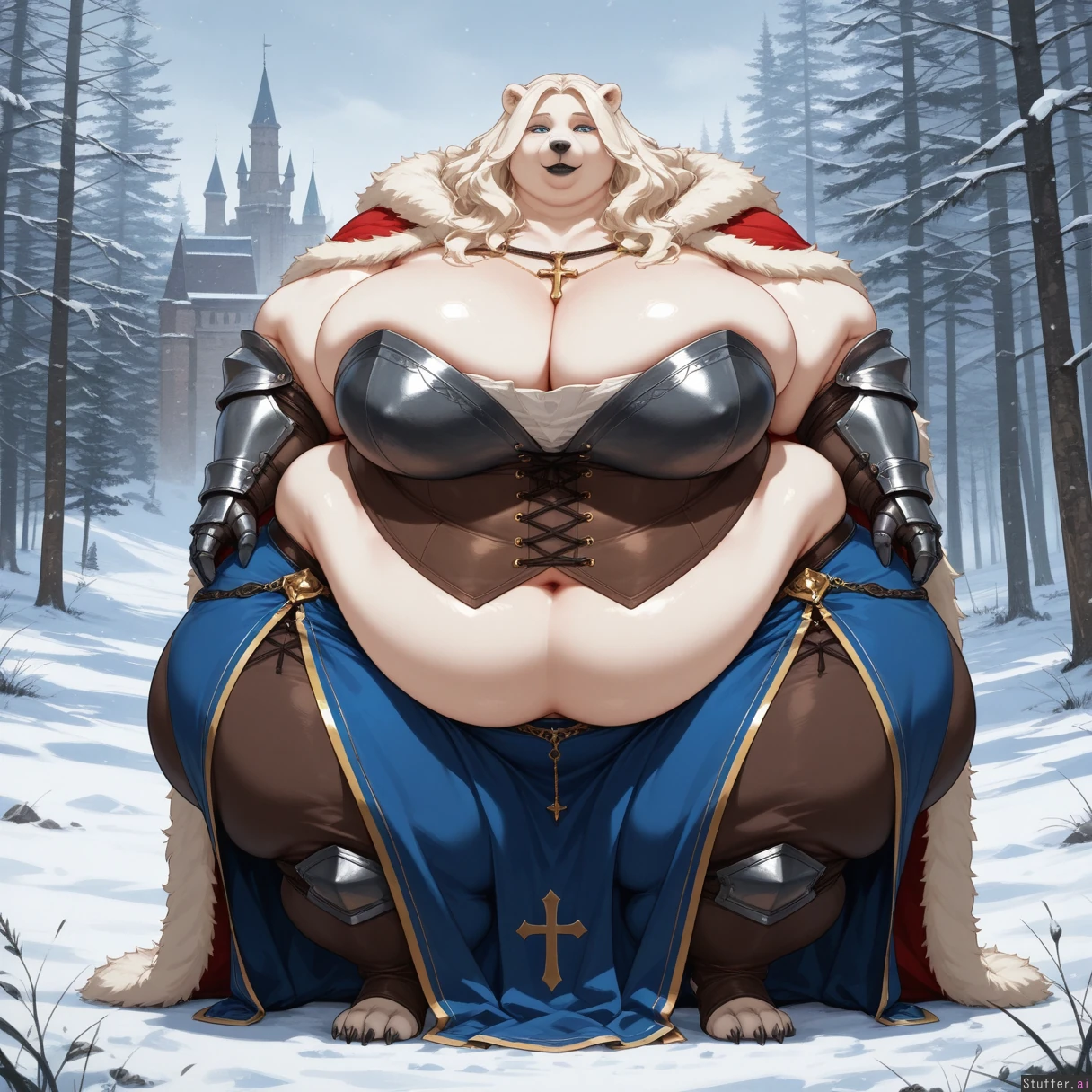 solo, anthro, polar bear, tall, fat_arms, blue long skirt, armor, cross, posing, full body view, wavy_hair, white_hair, long_hair, blue_eyes, fully_clothed, castle, outdoors, gauntlets, digitigrade, standing, snowing, forest, fur_cape, brown_pants, corset, (black lipstick) (huge hips:1.5), (huge thighs:1.2), (huge breasts:1.3), (ussbbw), (fat calves), (morbidly obese:1.4), (fat rolls), double_chin, chubby_cheeks