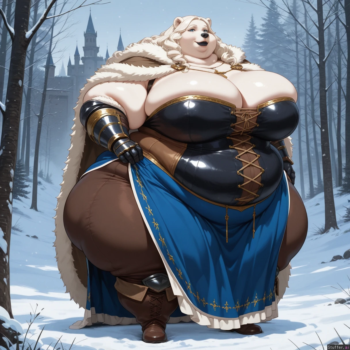 solo, anthro, polar bear, tall, fat_arms, blue long skirt, armor, cross, posing, full body view, wavy_hair, white_hair, long_hair, blue_eyes, fully_clothed, castle, outdoors, gauntlets, boots, standing, snowing, forest, fur_cape, brown_pants, corset, (black lipstick) (huge hips:1.5), (huge thighs:1.2), (huge breasts:1.3), (ussbbw), (fat calves), (morbidly obese:1.4), (fat rolls), double_chin, chubby_cheeks