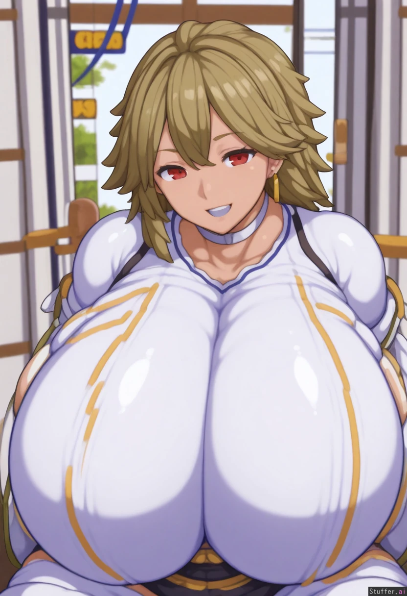 solo_female, mature face, tan, long_black_hair, asymmetrical hair, blonde_tips, red_eyes, choker, large earrings, sitting in_small_booth, window view of forest, midriff_exposed, white top, black gym shorts ( expansion:3)