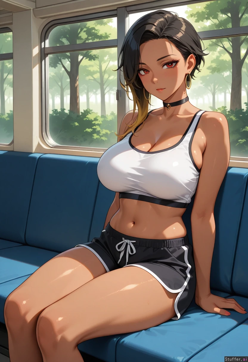 solo_female, mature face, tan, long_black_hair, asymmetrical hair, blonde_tips, red_eyes, choker, large earrings, sitting in_small_booth, window view of forest, midriff_exposed, white top, black gym shorts ( expansion)