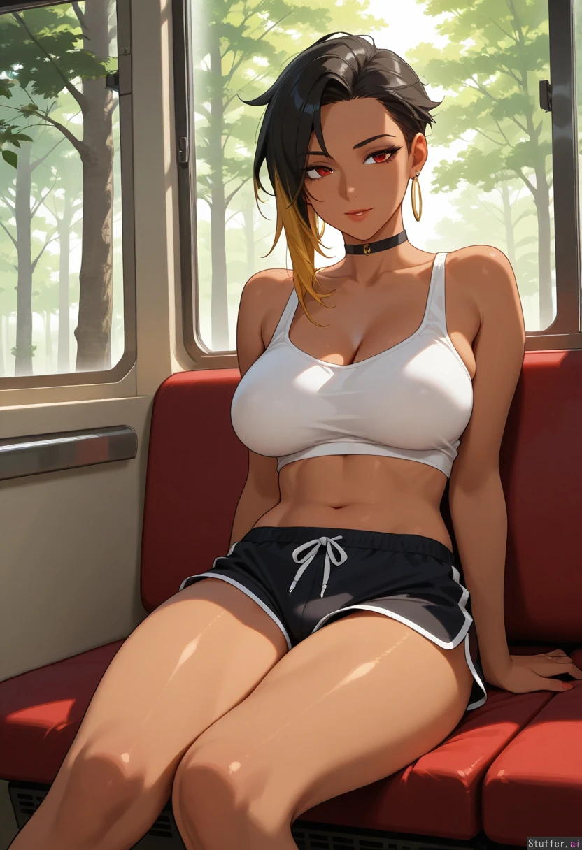 solo_female, mature face, tan, long_black_hair, asymmetrical hair, blonde_tips, red_eyes, choker, large earrings, sitting in_small_booth, window view of forest, midriff_exposed, white top, black gym shorts ( explode:1.6)
