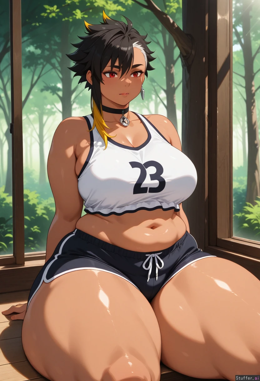 solo_female, mature face, tan, long_black_hair, asymmetrical hair, blonde_tips, red_eyes, choker, large earrings, sitting in_small_booth, window view of forest, midriff_exposed, white top, black gym shorts ( extra_thick_thighs:1.8)