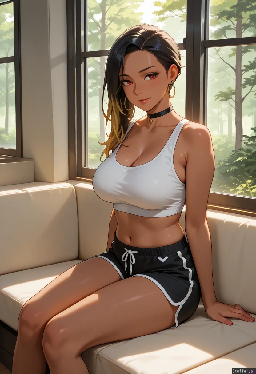 solo_female, mature face, tan, long_black_hair, asymmetrical hair, blonde_tips, red_eyes, choker, large earrings, sitting in_small_booth, window view of forest, midriff_exposed, white top, black gym shorts ( female_pred)