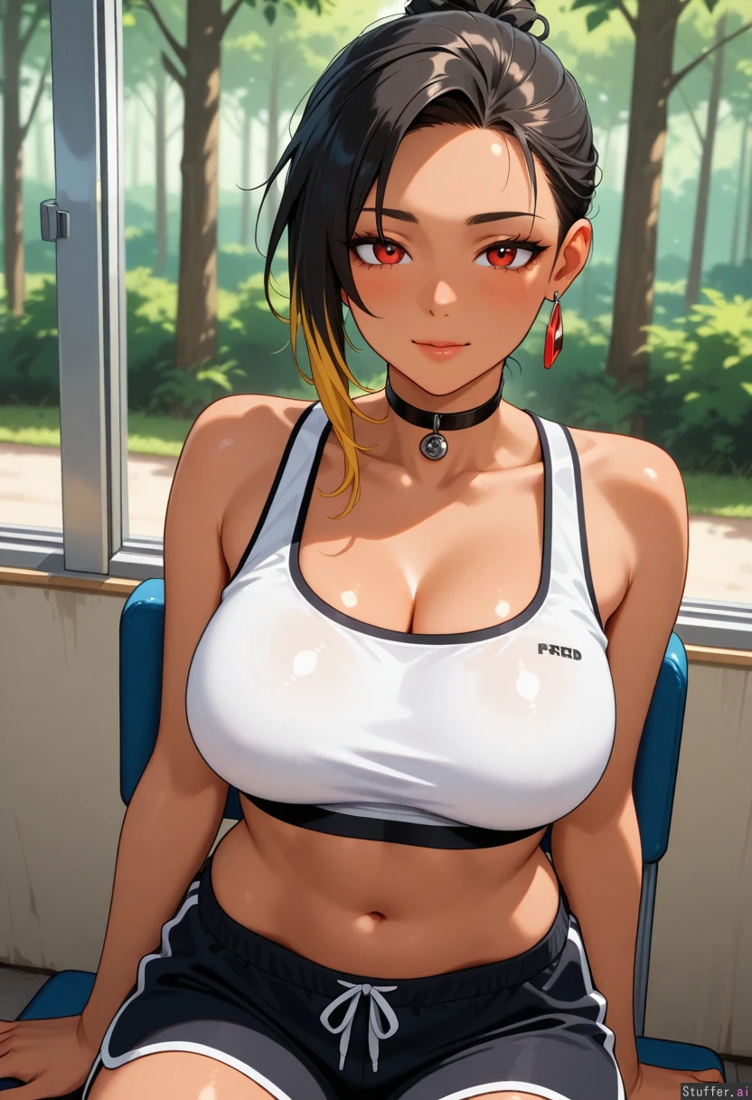 solo_female, mature face, tan, long_black_hair, asymmetrical hair, blonde_tips, red_eyes, choker, large earrings, sitting in_small_booth, window view of forest, midriff_exposed, white top, black gym shorts ( female_pred:1.8)