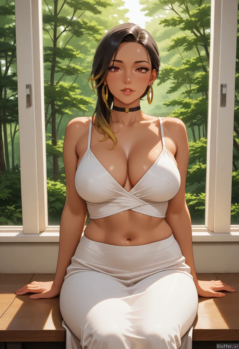 solo_female, mature face, tan, long_black_hair, asymmetrical hair, blonde_tips, red_eyes, choker, large earrings, sitting in_small_booth, window view of forest, midriff_exposed, white dress ( female_pred:2)