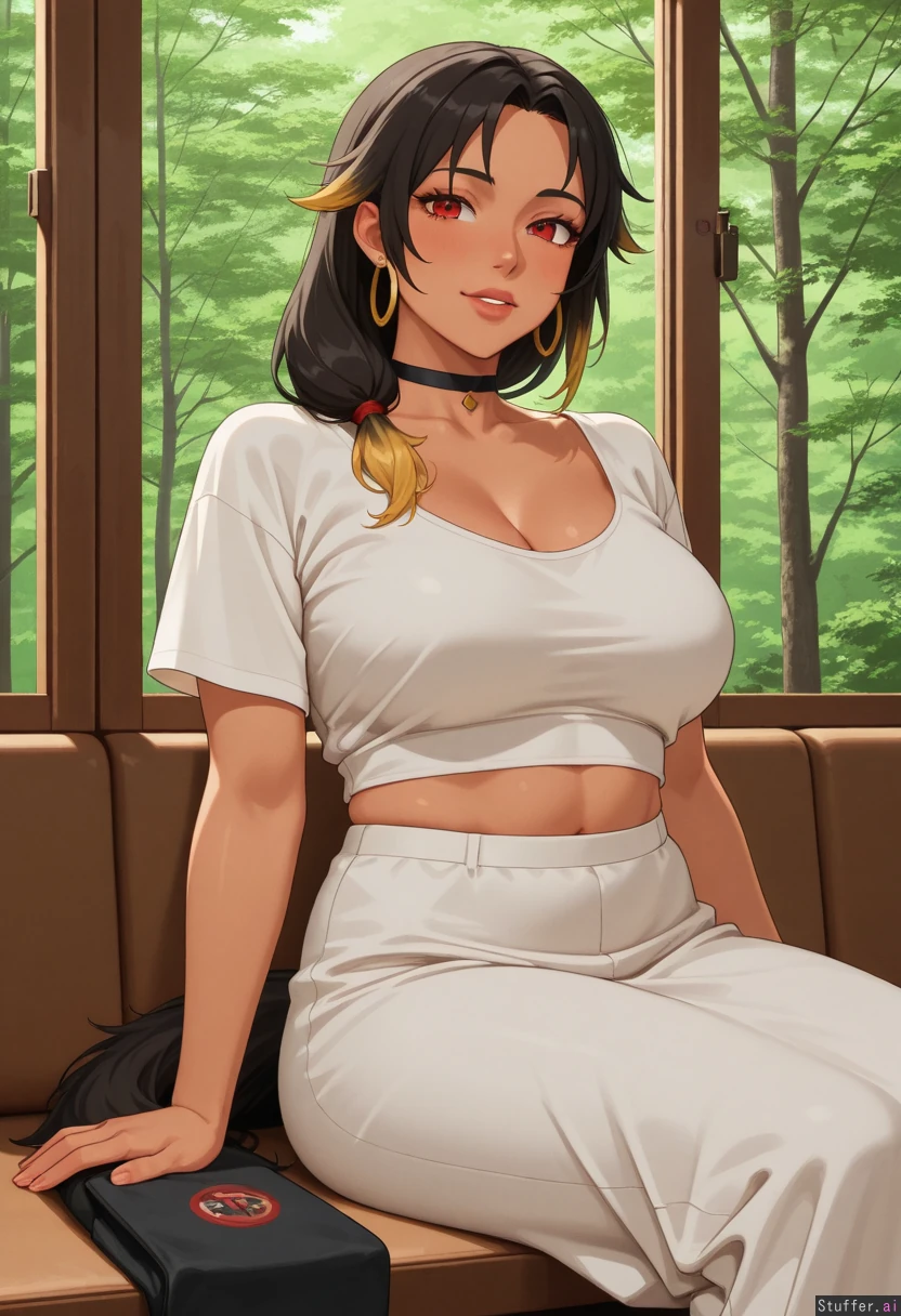 solo_female, mature face, tan, long_black_hair, asymmetrical hair, blonde_tips, red_eyes, choker, large earrings, sitting in_small_booth, window view of forest, midriff_exposed, white dress ( female_pred:2.4)