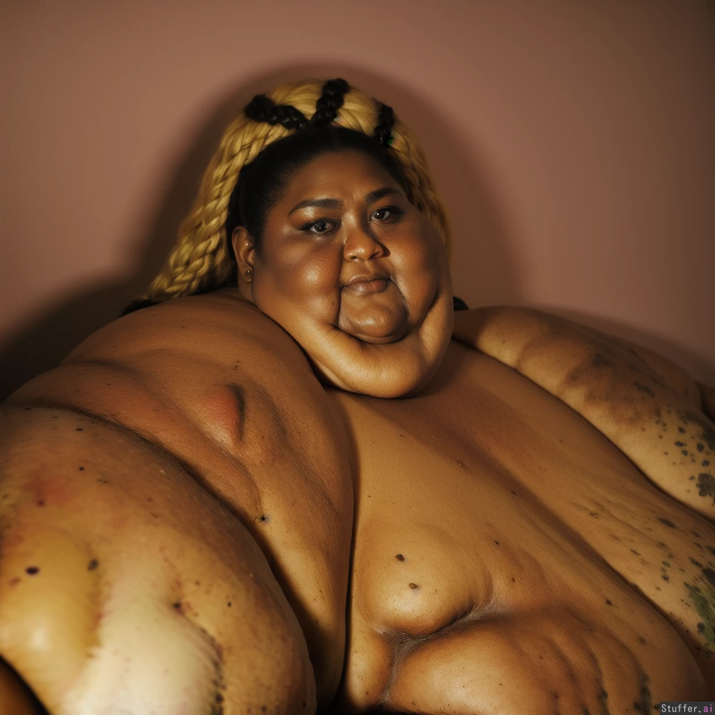 masterpiece, best quality, score_7. Photo realistic, ultra high quality, african ssbbw, beautiful face:1.4, (ultra double chin:1.9), (ultra fat face:1.9), ultra huge legs:1.9), (ultra huge arms:1.9), black braided hair:1.4