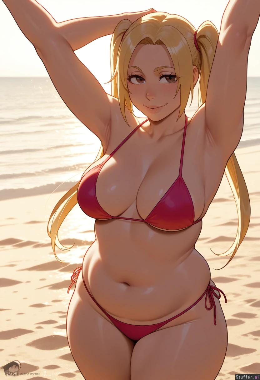 solo, masterpiece, amazing resolution, nyantcha(artist), krekkov(artist), dramatic lighting, intricate details, detailed eyes, hdr, best quality, (soft shading), dim lighting, realistic lighting, standing in sand, teasing (tilting head sideways, stretching arms), looking at viewer, 1woman, (((Hiyori Sarugaki from Bleach))), ((alt mommy)), short high pigtails short-cut straight_hair, brown eyes, flirty, blonde hair with blonde highlights, her bangs are blonde, wide hips, thick thighs, medium breasts, (chubby belly:1.2), tummy pooch, legs crossed, relaxed, sweet, nave, flushed, ((chubby:1.6)), chubby figure, fatass, large protruding belly, Light red bikini top, light red bikini bottom, Beach, outside,