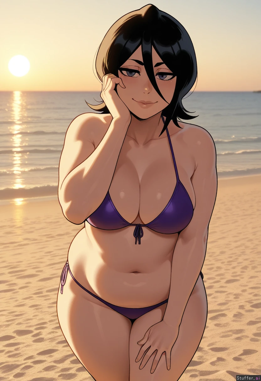 solo, masterpiece, amazing resolution, nyantcha(artist), krekkov(artist), dramatic lighting, intricate details, detailed eyes, hdr, best quality, (soft shading), dim lighting, realistic lighting, standing in sand, teasing (tilting head forward, caressing cheek), looking at viewer, 1woman, (((Rukia Kuchiki from Bleach))), ((alt mommy)), short bob straight_hair, grey eyes, flirty, black hair with black highlights, her bangs are black, wide hips, thick thighs, large full breasts, (chubby belly:1.2), tummy pooch, legs crossed, relaxed, sweet, nave, flushed, ((chubby:1.6)), chubby figure, fatass, large protruding belly, Purple bikini top, purple bikini bottom, Beach, outside,