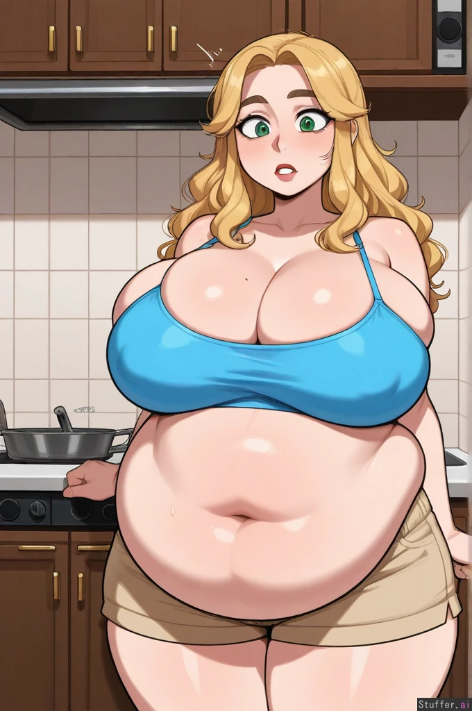 Solo, 1woman, Krekkov (artist), KAMII MOMORU(artist), vanripper(artist), (highly detailed), (best quality), (perfect proportions), ((Wavy blonde hair, perm, green eyes)), ((beautiful perfect skin)), ((blue crop top, khaki shorts)), plump breasts, dark red lipstick, ((standing in kitchen)), (deep cleavage, chunky curvaceous woman), (gluttonous girlfriend cannot stop binge eating and overeating), (her feeder boyfriend keeps enabling her weight_gain), (greedy plump girlfriend is stuffing her rapidly swelling belly with enormous portions every chance she gets), (huge round_belly:1.3, gigantic_belly:1.5), (shocked college student feels unborn_kicking)