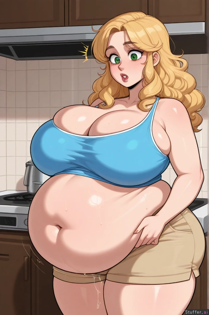 Solo, 1woman, Krekkov (artist), KAMII MOMORU(artist), vanripper(artist), (highly detailed), (best quality), (perfect proportions), ((Wavy blonde hair, curly 80s hair, green eyes)), ((beautiful perfect skin)), ((blue crop top, khaki shorts)), plump breasts, dark red lipstick, ((standing in kitchen)), (deep cleavage, chunky curvaceous woman), (gluttonous girlfriend cannot stop binge eating and overeating), (her feeder boyfriend keeps enabling her weight_gain), (greedy plump girlfriend is stuffing her rapidly swelling belly with enormous portions every chance she gets), (huge round_belly:1.3, gigantic_belly:1.5), (shocked feedee girlfriend cannot believe how big she is getting, she has given up on controlling her weight_gain), side_profile, (huge cumflated_belly stretching bigger every day), (big spherical_belly:1.6 stretching to please her boyfriend)