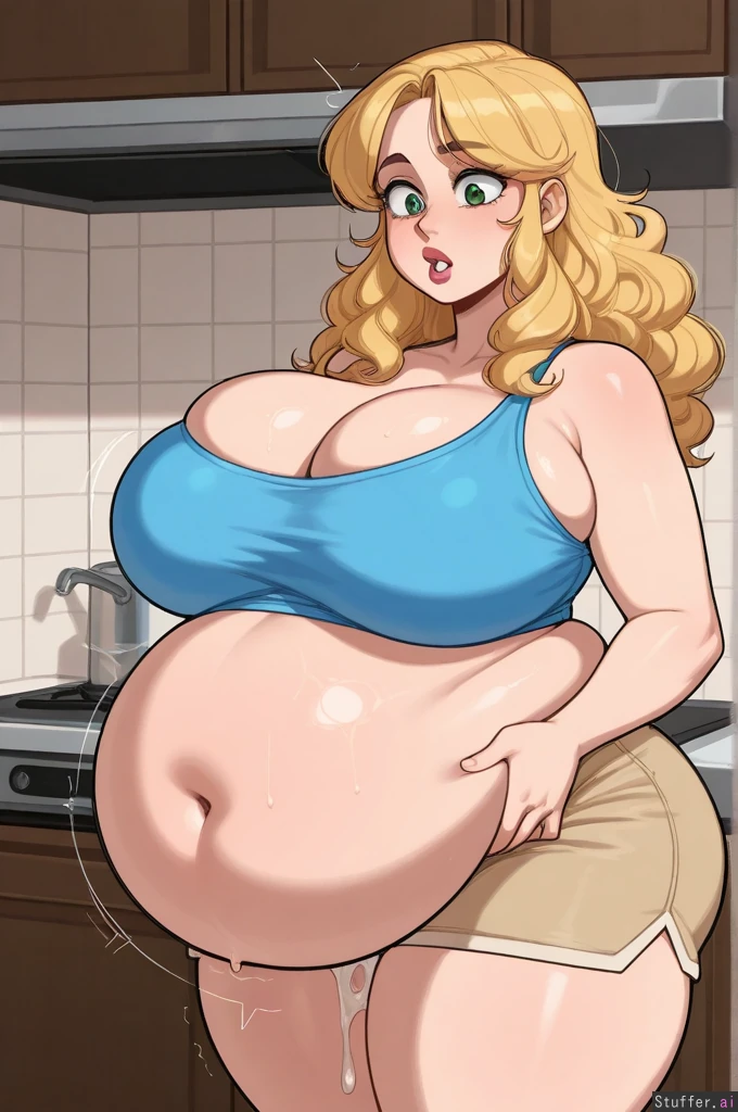 Solo, 1woman, Krekkov (artist), KAMII MOMORU(artist), vanripper(artist), (highly detailed), (best quality), (perfect proportions), ((Wavy blonde hair, curly 80s hair, green eyes)), ((beautiful perfect skin)), ((blue crop top, khaki shorts)), plump breasts, dark red lipstick, ((standing in kitchen)), (deep cleavage, chunky curvaceous woman), (gluttonous girlfriend cannot stop binge eating and overeating), (her feeder boyfriend keeps enabling her weight_gain), (greedy plump girlfriend is stuffing her rapidly swelling belly with enormous portions every chance she gets), (huge round_belly:1.3, gigantic_belly:1.5), (shocked feedee girlfriend cannot believe how big she is getting, she has given up on controlling her weight_gain), side_profile, (huge cumflated_belly stretching bigger every day), (enormous feedee feels unborn_kicking deep beneath her belly_fat)