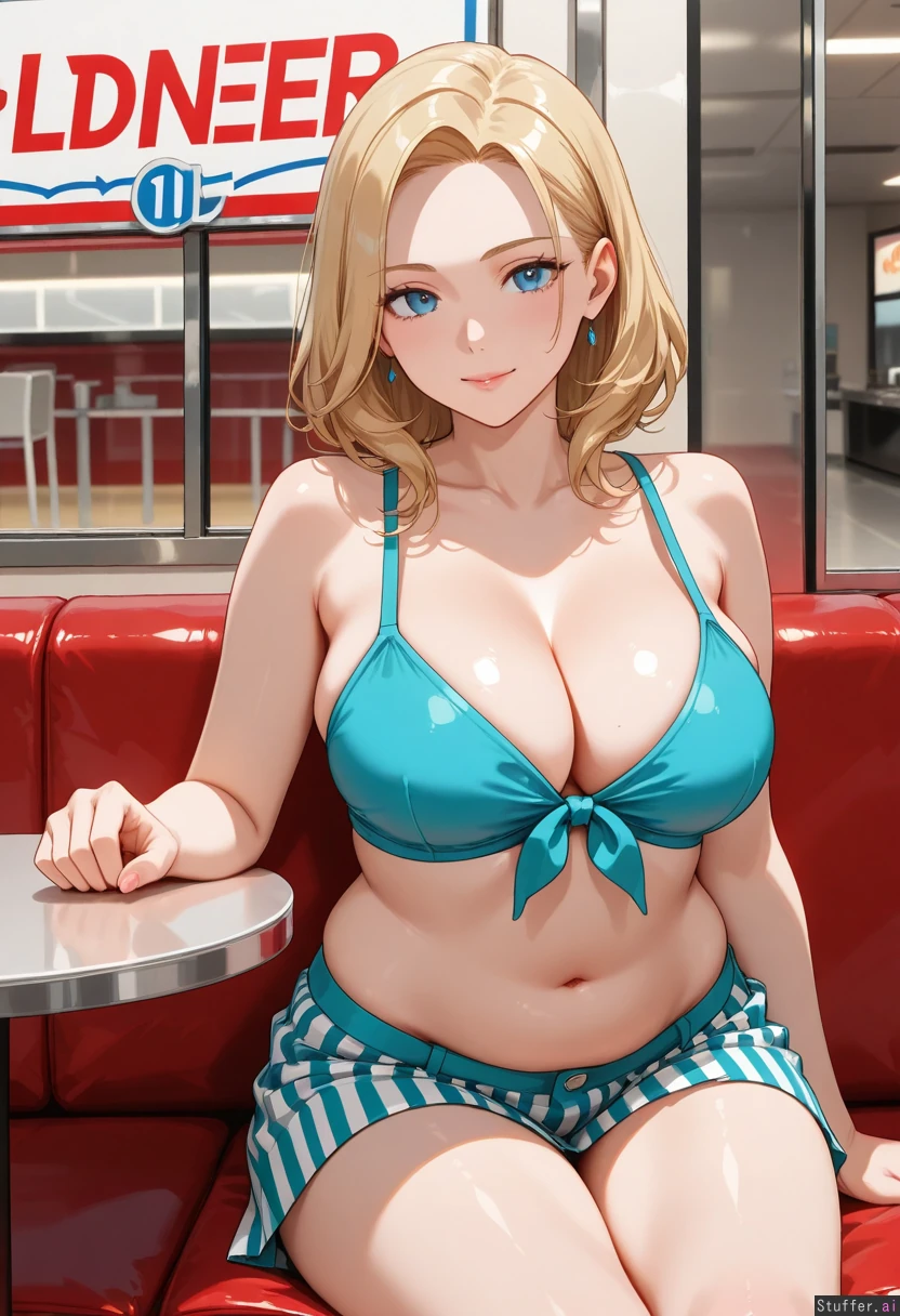 (Blonde girl, pretty face, blue eyes, sitting at a diner table) (Breasts resting on diner table, belly under the table)