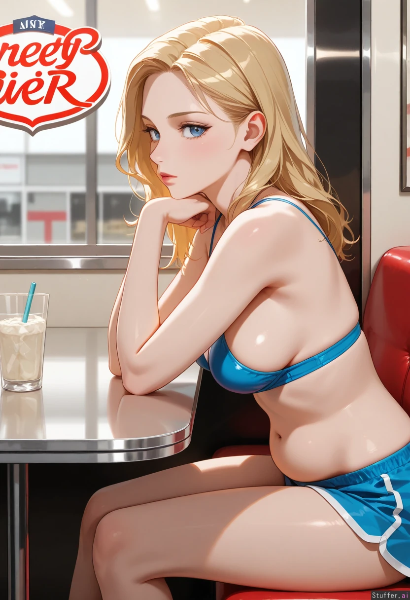 (Blonde girl, pretty face, blue eyes, sitting at a diner table, side view) (Breasts resting on diner table, belly under the table)