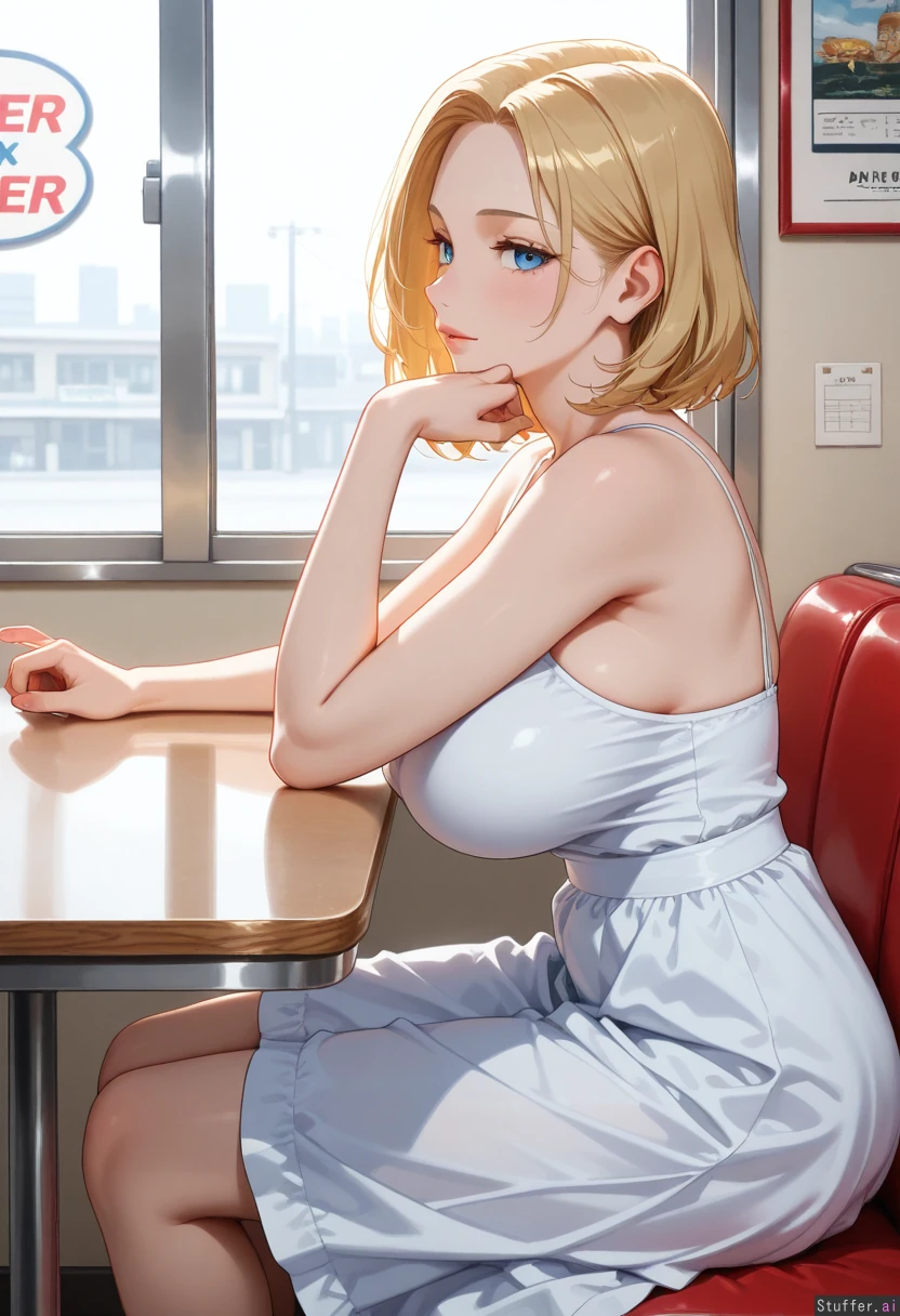 (Blonde girl, pretty face, blue eyes, sitting at a diner table, side view, wearing sundress) (Gigantic oversized breasts resting on diner table, gigantic belly under the table:0.6)