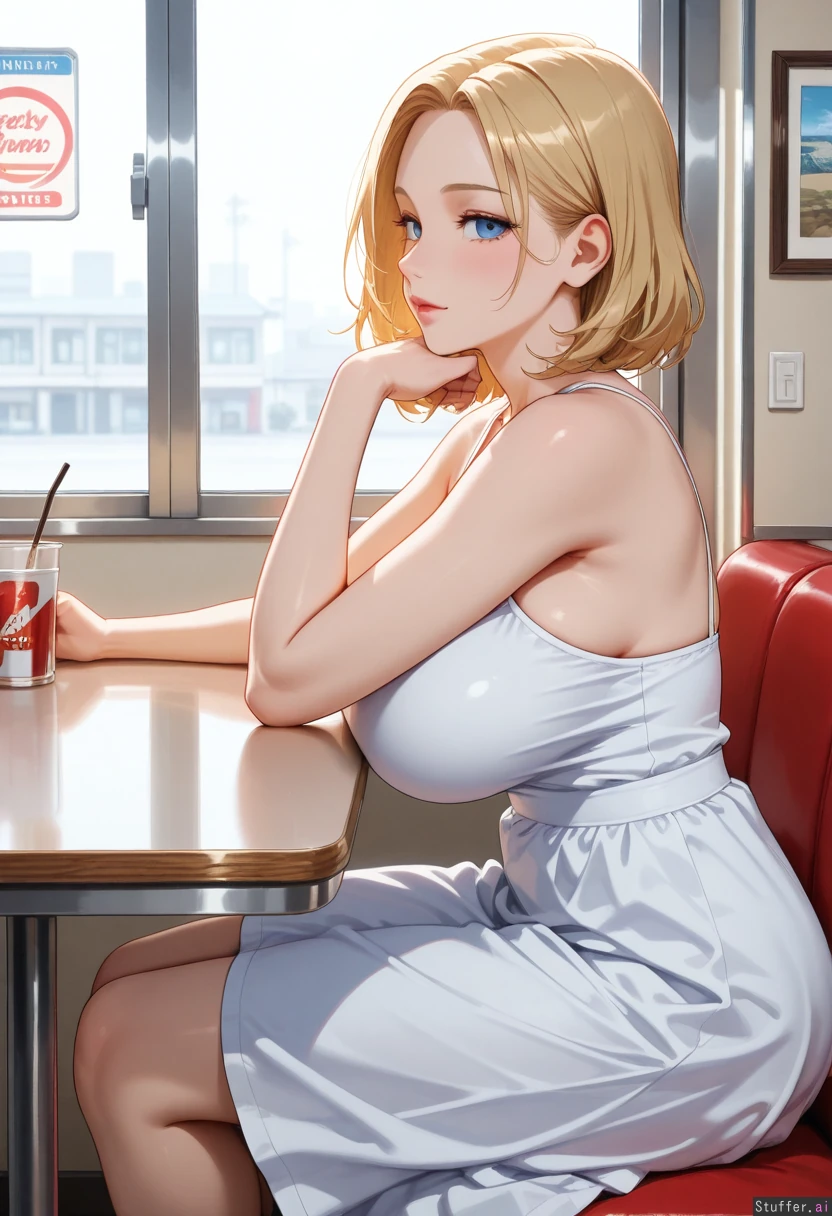 (Blonde girl, pretty face, blue eyes, sitting at a diner table, side view, wearing sundress)