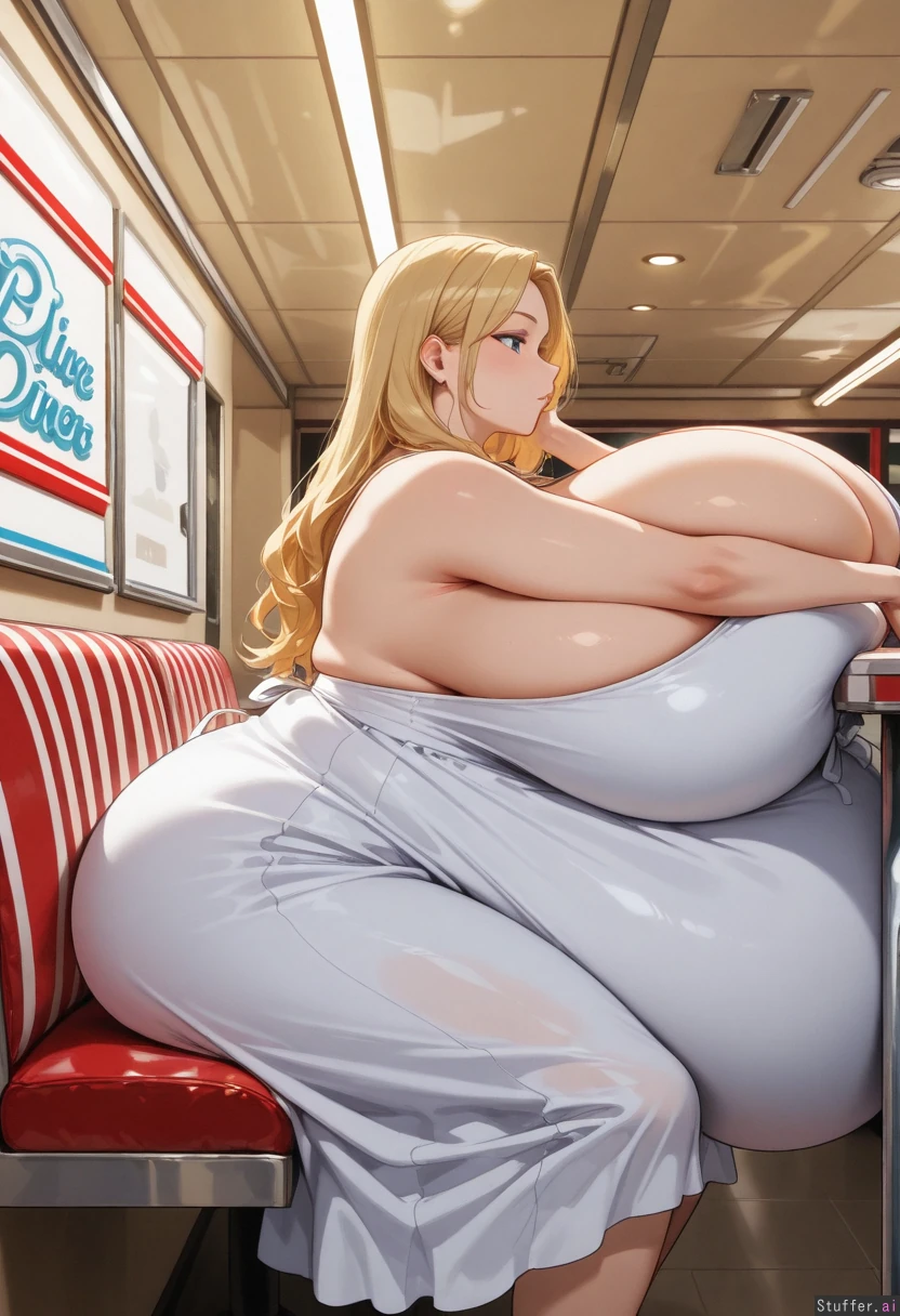 (Blonde girl, pretty face, blue eyes, sitting at a diner table, side view, wearing sundress) (Gigantic oversized breasts resting on diner table, gigantic belly under the table:1.3)