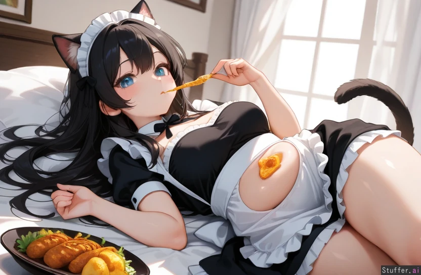 8k quality, perfect anatomy, detailed background, beautiful face and eyes,bedroom, detailed face Maid uniform, cat girl, cat ears, 1 cat_tail, black long hair over shoulders, thick thighs, medium breasts, maid skirt, light blue eyes, plump belly Plate of food in hand, eating, food near mouth, laying in bed Front view