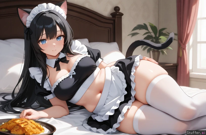 8k quality, perfect anatomy, detailed background, beautiful face and eyes,bedroom, detailed face Maid uniform, cat girl, cat ears, 1 cat_tail, black long hair over shoulders, thick thighs, medium breasts, maid skirt, light blue eyes, plump belly Plate of food, laying in bed Front view