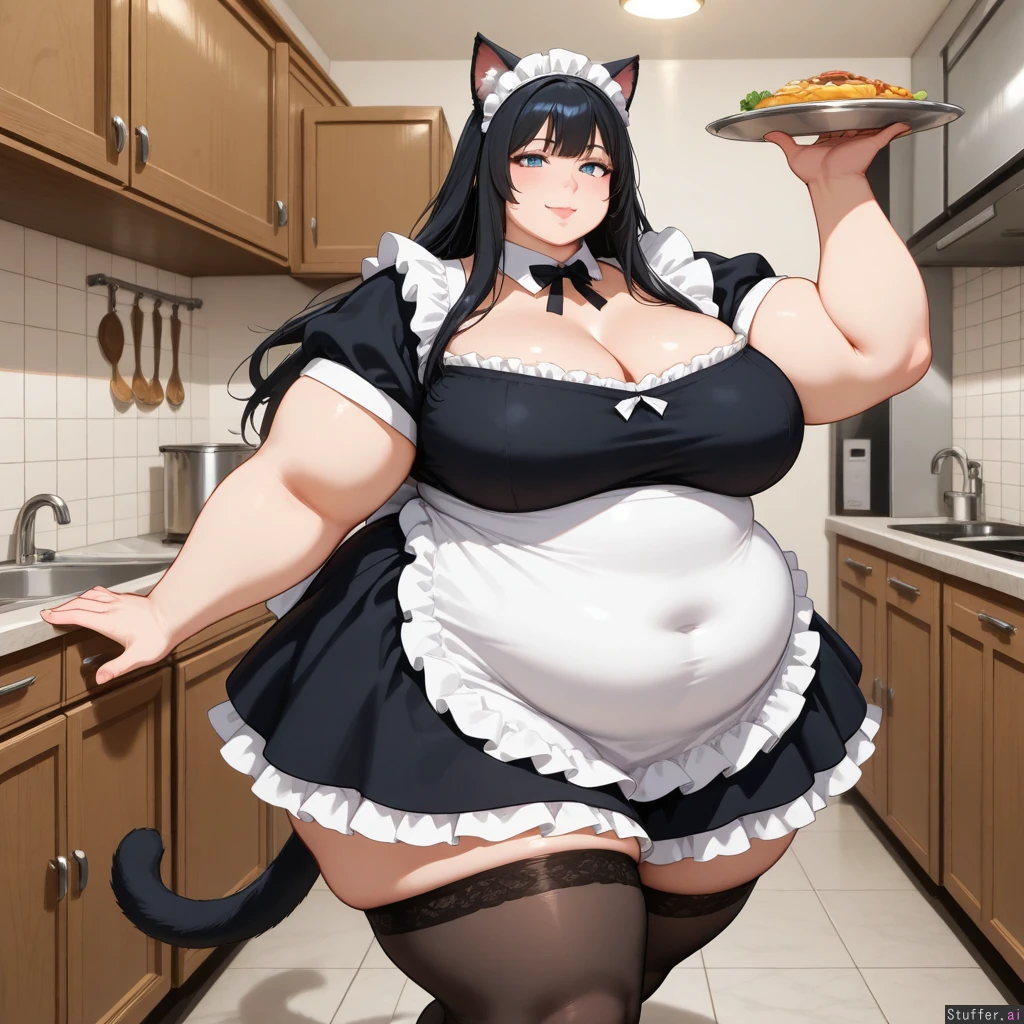 8k quality, perfect anatomy, detailed background, beautiful face and eyes,bedroom, detailed face, kitchen , cat girl, cat ears, 1 cat_tail, black long hair over shoulders, fat thighs, big breasts, light blue eyes, fat arms, big belly, belly bulges, obese, fat face, double chin, adult, long arms, maid uniform, maid skirt, maid Happy, walking, plate with food in hand Viewed from_front