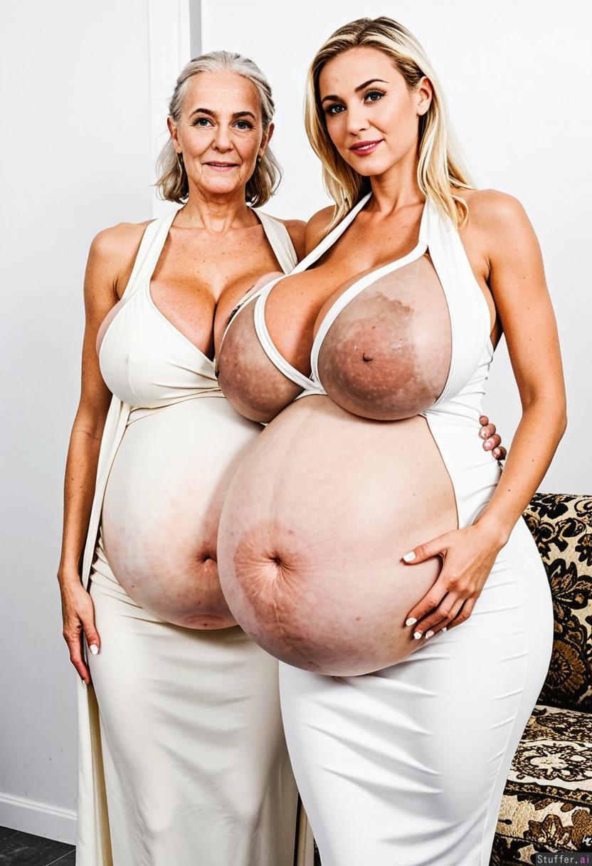 (Gigantic cleavage:2.8), (platinum blonde hair) (tight dress:2.5), (pregnant belly:2.6), (granny:2.2), (massive hips:2.9), (fully clothed), (green eyes), (two women)